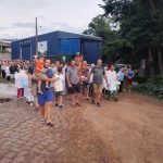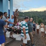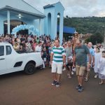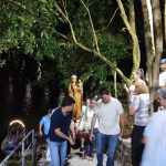 Logo após, começou a caminhada em direção às águas do Rio do Peixe, onde a imagem seguiu em procissão fluvial pelo Rio do Peixe até as imediações da Ponte Irineu Bornhausen.