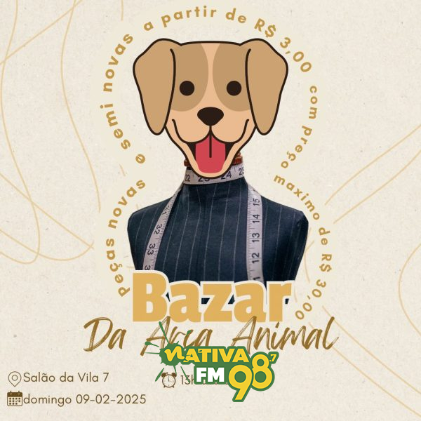 O Projeto Arca Animal realizará um super bazar beneficente no próximo domingo, dia 9, no Salão da Vila 7 de Julho. O evento acontecerá das 13h às 20h e tem como objetivo arrecadar fundos para ajudar animais em situação de vulnerabilidade.