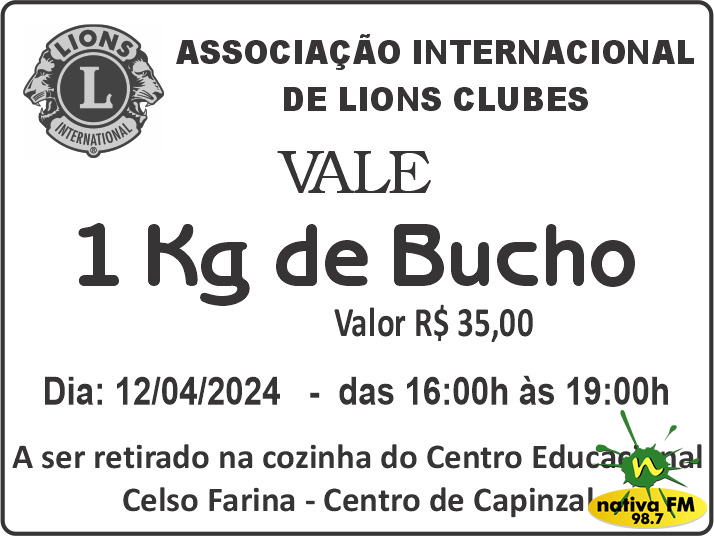 O Lions Clube Capinzal e Ouro realiza neste dia 12 de abril mais uma edição da tradicional buchada. Como de costume, a preparação é feita por uma equipe com longa experiência e entregue junto às instalações do Centro Educacional Prefeito Celso Farina no centro de Capinzal.