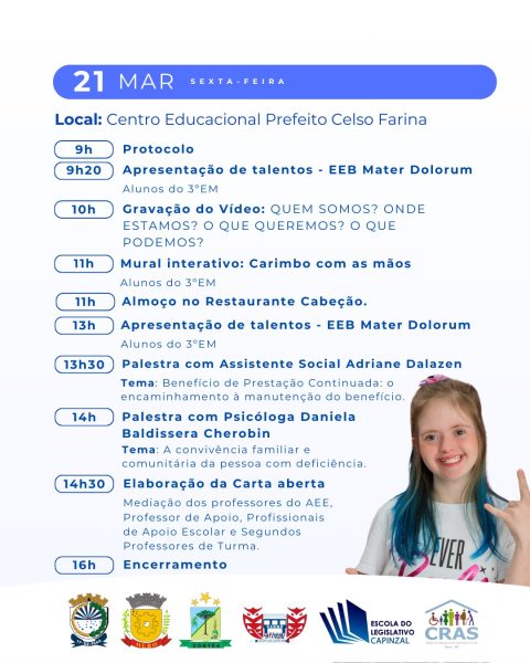A programação prossegue nesta sexta-feira, dia 21 encerrando no final da tarde, no Centro Educacional Prefeito Celso Farina.