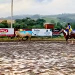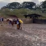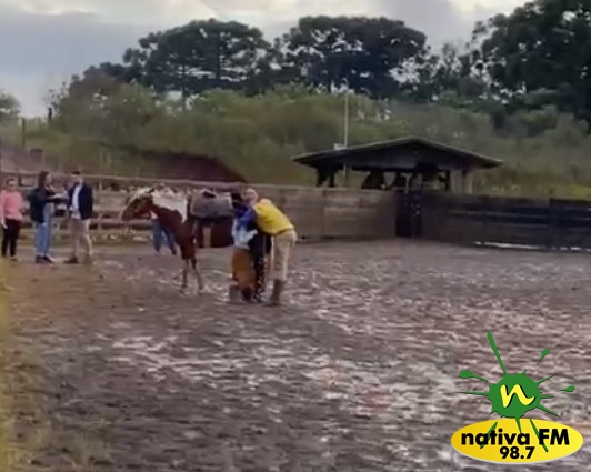 Marcio montado a cavalo e Michele do outro lado se emocionaram com o momento e mencionaram que o nome da criança é uma homenagem a José Felipe Gomes, um laçador conhecido de Michele, o qual conviveu sua infância e acabou falecendo no ano passado.