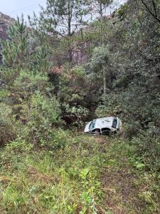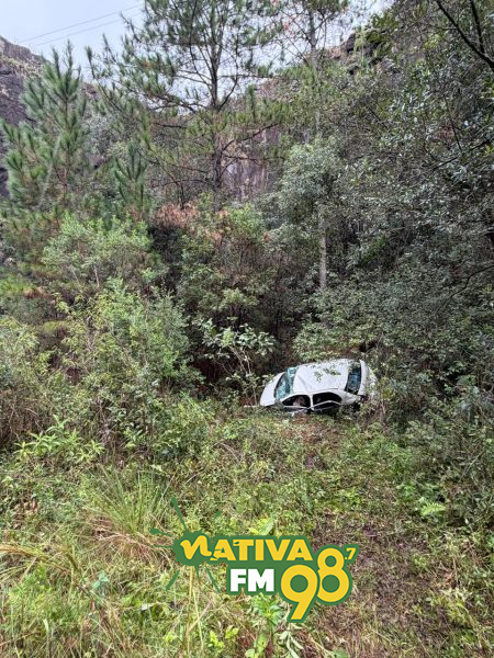 No local, os socorristas encontraram um veículo Volkswagen Gol branco, com placas Mercosul, completamente destruído após a queda na ribanceira.