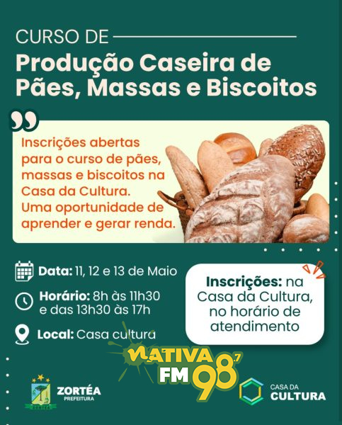 A Casa da Cultura de Zortéa está com inscrições abertas para o curso de Produção Caseira de Pães, Massas e Biscoitos. A iniciativa busca oferecer qualificação e incentivar a geração de renda por meio da produção de alimentos.