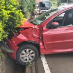 O acidente envolveu um Peugeot de cor vermelha, utilizado para transporte por aplicativo, e uma motocicleta Honda.