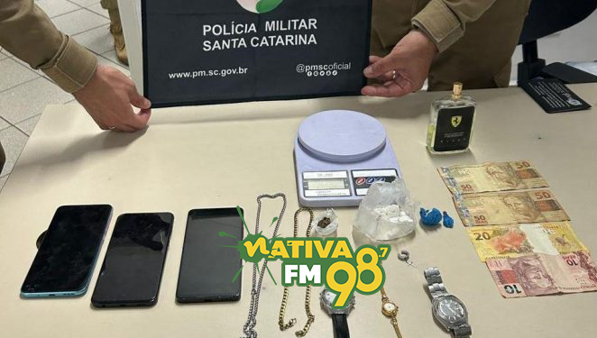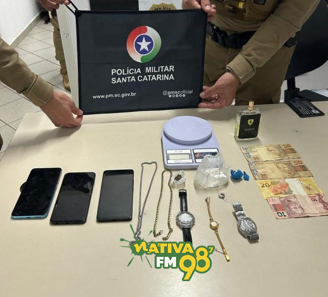 Já no interior de uma mochila, os policiais localizaram dois aparelhos celulares, três relógios, um perfume, cartões diversos, uma balança de precisão e dinheiro em espécie, levantando suspeitas sobre a origem dos itens.