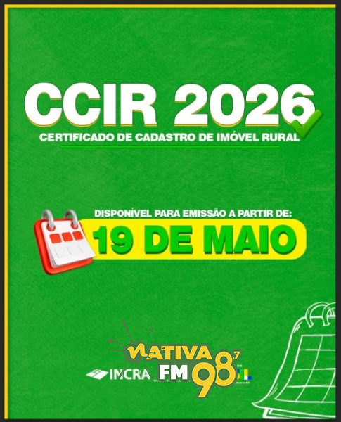 Os produtores rurais já podem se organizar para a emissão do Certificado de Cadastro de Imóvel Rural (CCIR) 2026. O documento estará disponível para emissão a partir do dia 19 de maio.