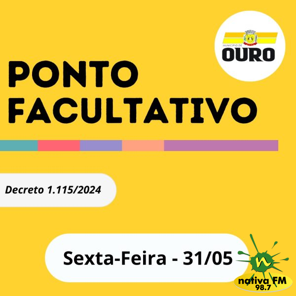 A Administração Municipal de Ouro fará ponto facultativo em todas as repartições públicas nesta sexta-feira, dia 31, pós feriado de Corpus Cristhi.