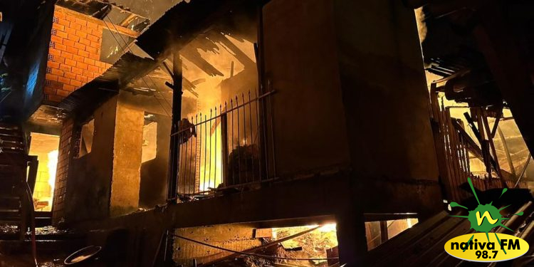 Um incêndio de grandes proporções atingiu uma residência de madeira, na noite de terça-feira, dia 11. O Corpo de Bombeiros foi acionado por volta das 21h11min e deslocou suas viaturas até a Rua Achiles Pedrini, na Vila Cachoeirinha.