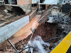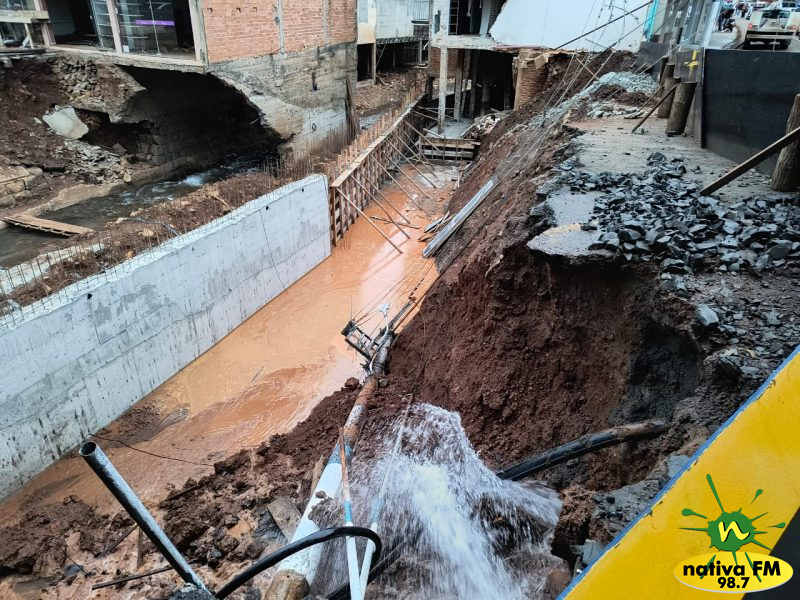 Estrutura cedeu durante escavação das obras da ponte na Rua Dom Vicente Gramazzio e também danificou rede de água