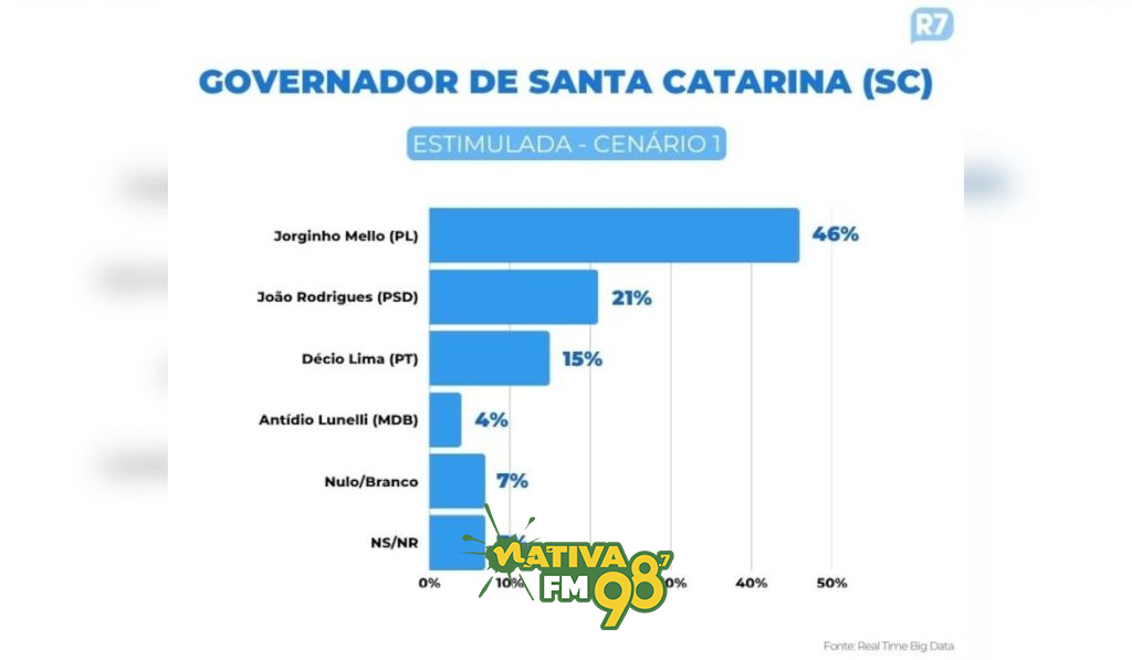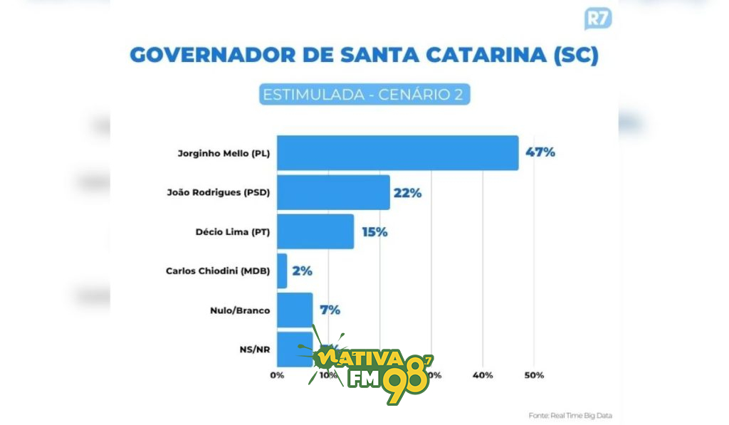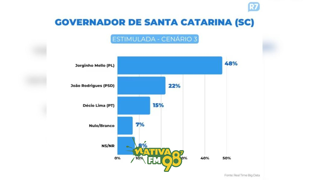 Em pesquisa realizada pelo Instituto Real Time Big Data sobre as intenções de voto para o cargo de governador em Santa Catarina, o atual chefe do Executivo estadual, Jorginho Mello (PL), aparece na liderança em todos os cenários simulados (veja os detalhes em imagem mais abaixo).
