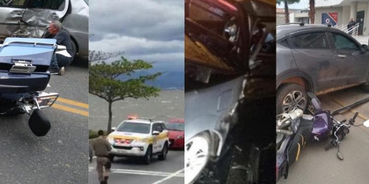 Nas rodovias estaduais, em 43 acidentes de sexta a domingo, 2 pessoas morreram e 6 ficaram em estado grave. Um acidente violento envolveu um carro e duas motos no começo da tarde de sábado, na SC-108, em Joinville. Uma terceira motocicleta quase foi atingida, mas conseguiu desviar.