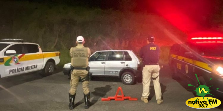 As duas forças de segurança trocaram informações e abordaram o veÃculo suspeito, um Fiat/Uno de Luis Alves/SC, na rodovia estadual SC-283.
