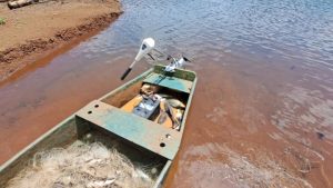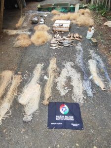Com eles, foram localizados petrechos de pesca e cerca de 400 metros de redes de pesca. Diante das irregularidades ainda foram apreendidos 1 motor elétrico, 1 motor à combustão, 1 barco de fibra desmontável, 4 sacos com redes emaranhadas e 3 espinhéis de pesca.