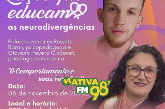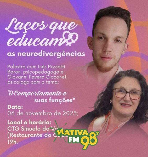 O projeto “Laços que educam as neurodivergências” promove nesta quinta-feira (6) um encontro voltado a pais, familiares, educadores e ao público em geral para dialogar sobre o tema “O comportamento e suas funções”. A atividade será realizada no CTG Sinuelo do Vale (Restaurante do Cabeção), em Capinzal, com início às 19h.