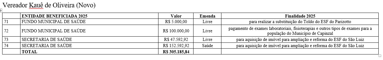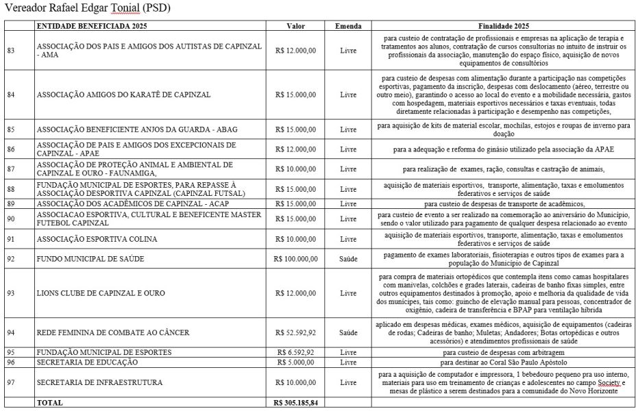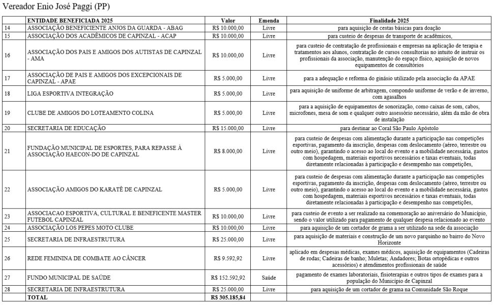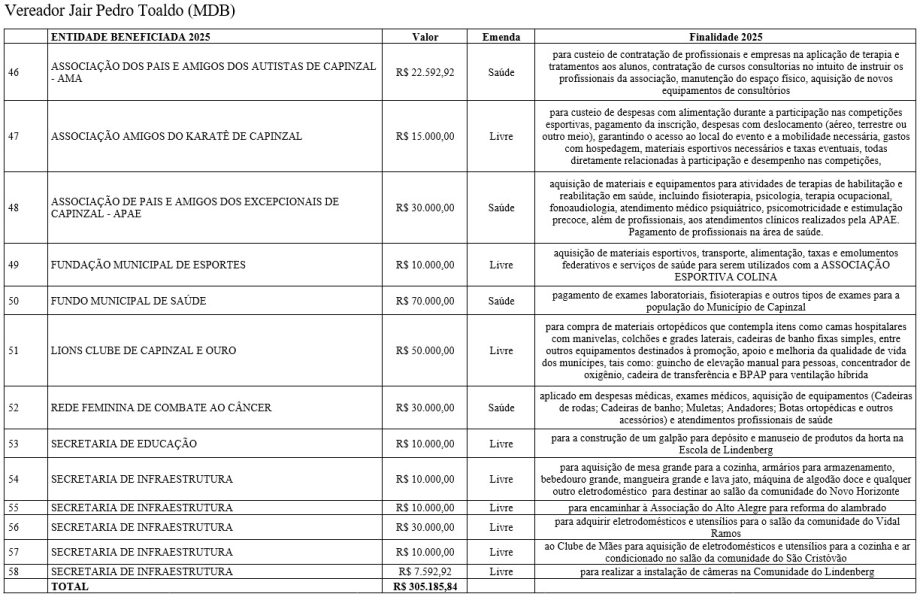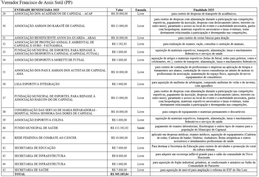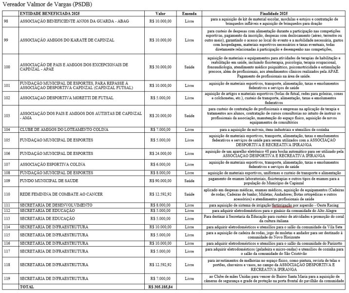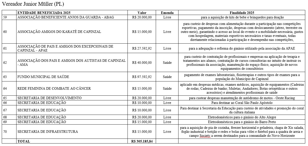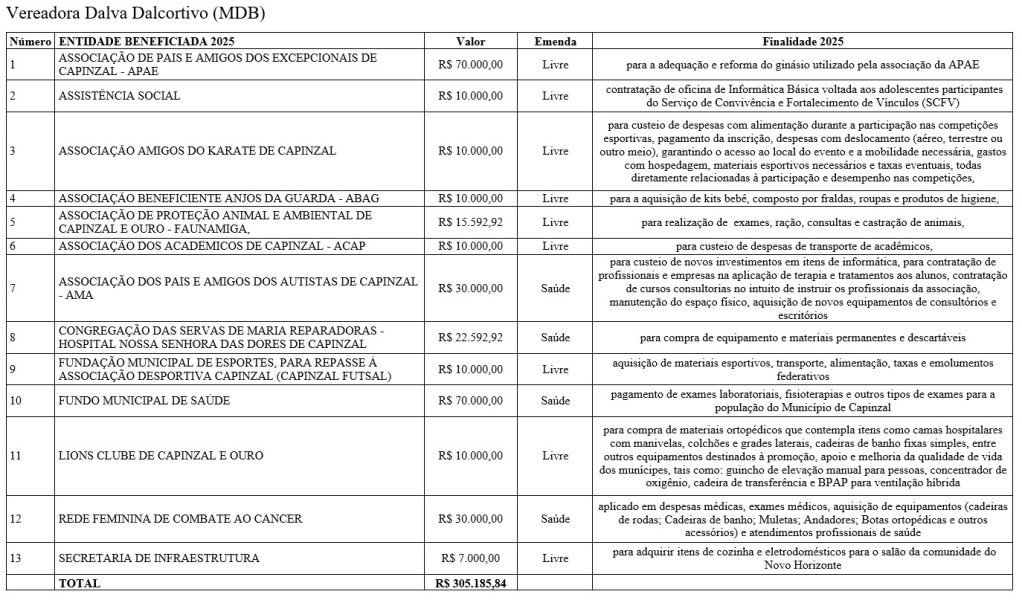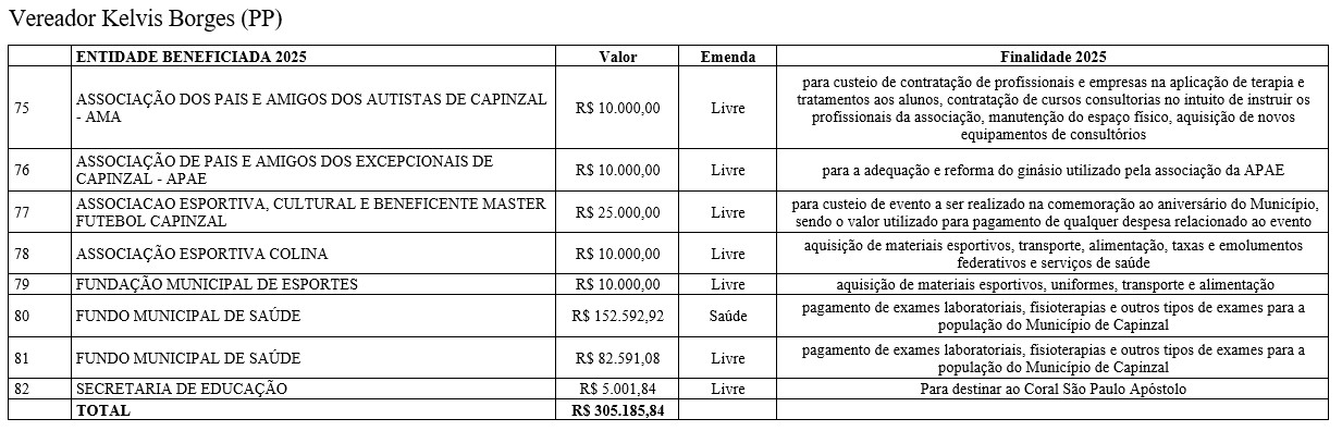 As emendas abrangem diferentes áreas do serviço público, com repasses voltados à saúde, educação, assistência social, infraestrutura, esporte, cultura e ao fortalecimento de entidades comunitárias. De acordo com os vereadores, os recursos atendem demandas apresentadas pela população e reforçam o papel do Legislativo na definição das prioridades do município.