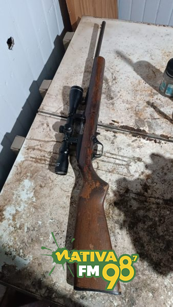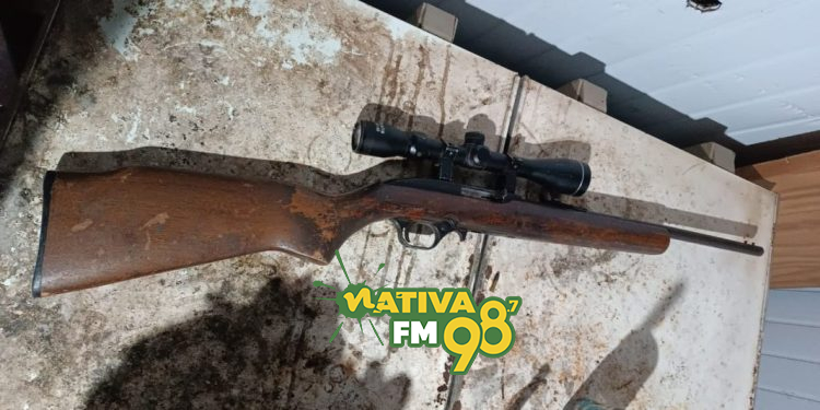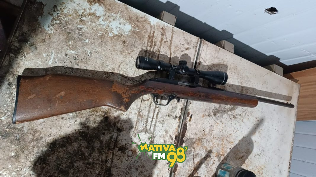 Durante buscas no interior da residência, a guarnição localizou uma arma de fogo do tipo rifle, calibre .22, além de munições, caracterizando o crime de posse irregular de arma de fogo.